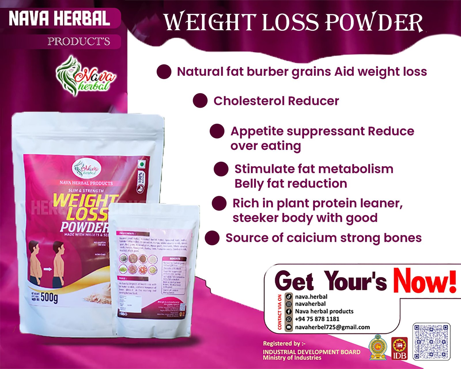 A natural blend of millets and superfoods designed to support healthy weight management. This herbal powder helps boost metabolism, control appetite, detoxify the body, and promote gradual, healthy weight loss. Packed with nutrient-rich ingredients, it nourishes the body while aiding in fat reduction and improving overall wellness.