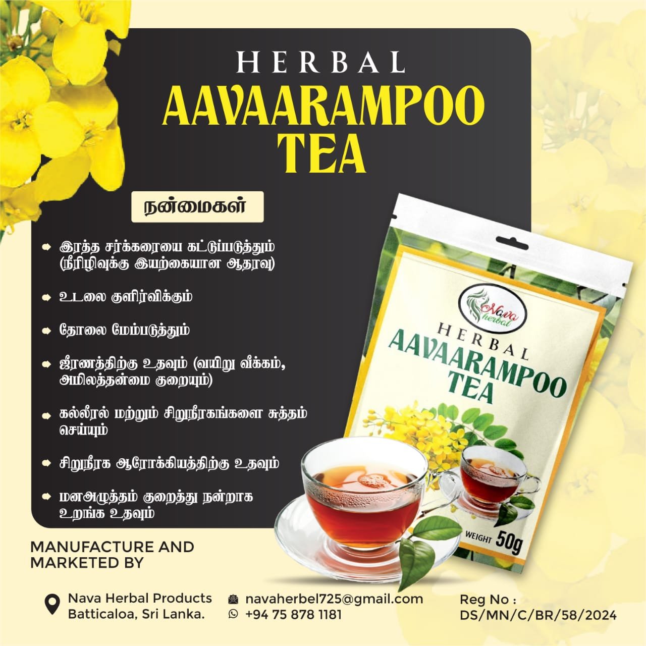 Nava Herbal Aavaaram Flower Tea is a soothing herbal infusion made from the flowers of the Aavaram (Sesbania grandiflora) plant. Known for its natural calming and detoxifying properties, this tea promotes overall wellness, refreshes the body, and helps maintain inner balance.
