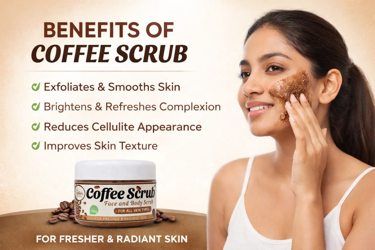 Coffee Scrub – Face & Body (100g) Reveal naturally glowing skin with our Coffee Scrub, specially crafted for both face and body. Enriched with natural coffee extracts, this scrub gently exfoliates dead skin cells, leaving your skin soft, smooth, and refreshed. It helps to brighten dull skin, improve texture, and promote a healthy, radiant glow. Suitable for all skin types, this scrub also helps reduce the appearance of roughness and gives your skin a fresh, rejuvenated feel after every use.